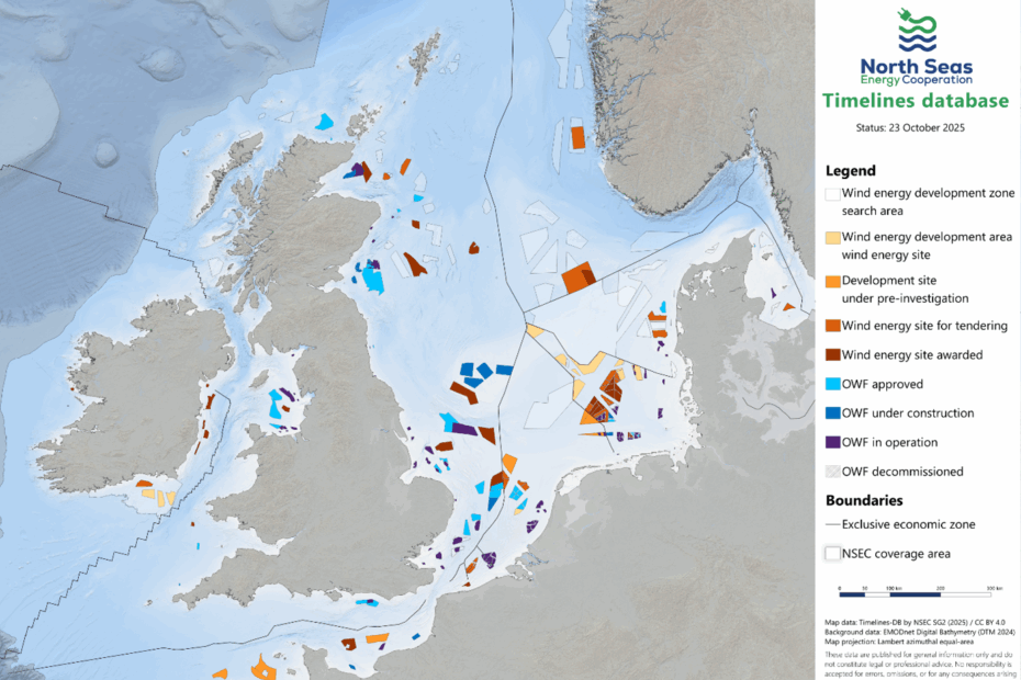 Im Rahmen der Zusammenarbeit in der Arbeitsgruppe SG2 der Nordsee-Energiekooperation (NSEC) wurde eine gemeinsame Datenbank erstellt, welche einen Ausblick über die Entwicklung der Offshore-Windenergie in der Nordsee bietet. Auf dem Energieministertreffen von NSEC in Ostende wurde die TIMELINES-Datenbank am 06.11. erstmals präsentiert. Die Datenbank stellt… Weiterlesen »TIMELINES – Neue harmonisierte Datenbank mit Informationen über Planung, Entwicklung und den Betrieb von Offshore-Windparks in der Nordsee