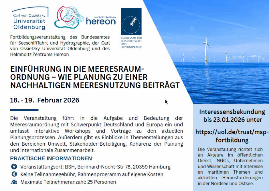 Liebe Interessierte der Meeresraumordnung, wir freuen uns, Sie nach dem Erfolg im Jahr 2024 erneut zur Fortbildungsveranstaltung „Einführung in die Meeresraumordnung – wie Planung zu einer nachhaltigen Meeresnutzung beiträgt“ einladen zu können! Diese einzigartige Fortbildung wird in Kooperation vom Bundesamt für Seeschifffahrt und Hydrographie, der… Weiterlesen »Einladung zur Fortbildung: „Einführung in die Meeresraumordnung – wie Planung zu einer nachhaltigen Meeresnutzung beiträgt“